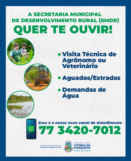 A Prefeitura de Vitória da Conquista, por meio da Secretaria Municipal de Desenvolvimento Rural (SMDR), está disponibilizando um número de whatsapp como canal de comunicação com os moradores da zona rural.