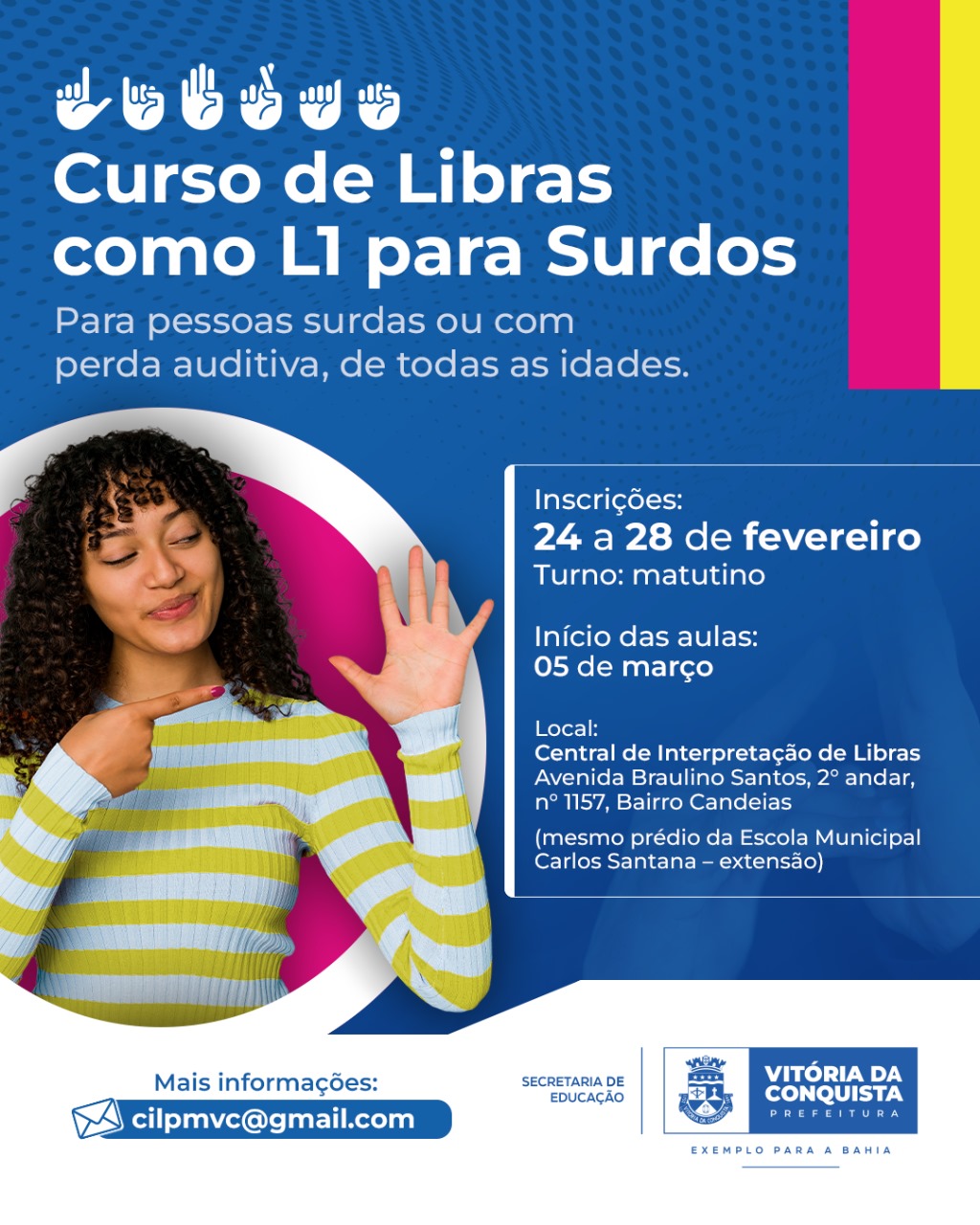 De 24 a 28 de fevereiro, estarão abertas inscrições para o Curso de Língua Brasileira de Sinais (Libras) nível 1 voltado para a população surda de todas idades. Os interessados podem se inscrever pessoalmente na sede da CIL, localizada na Avenida Braulino Santos, 1157, Candeias, portando carteira de identidade, CPF e comprovante de residência (originais e cópias).