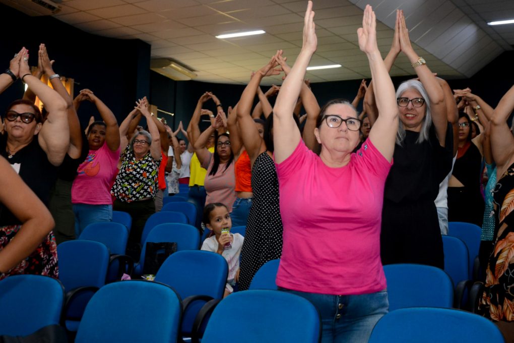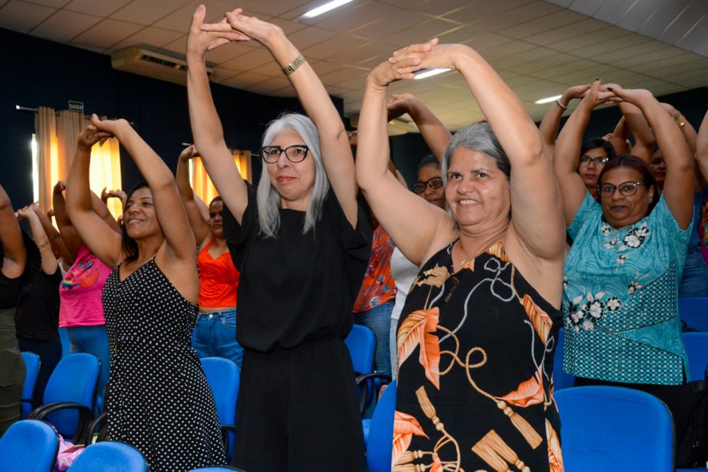 A fisioterapeuta Izaura Cristina Barbosa fez um momento de interação bem descontraído para animar os presentes. De acordo com ela, o trabalho que requer esforço repetitivo, a exemplo de manipular e cozinhar alimentos, precisa de um aquecimento prévio das mulheres. “Mesmo quando tiver na correria, nem que seja por cinco minutos, é importante vocês tirarem esse tempo para aquecer o corpo ou alongar, para sair daquela posição aqui de todo dia”