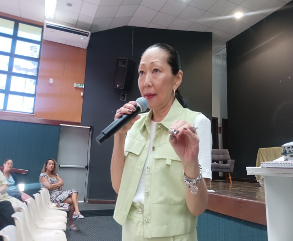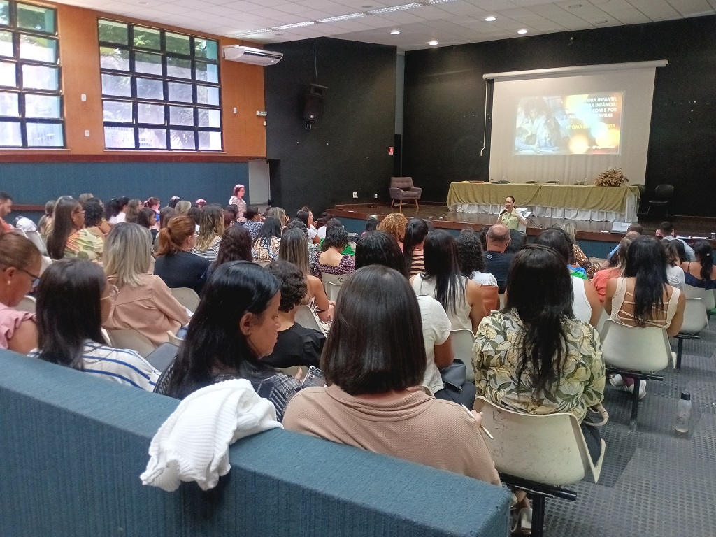 Pedagoga e especialista em Educação Infantil, Regina Shudo realizou a palestra de abertura com o tema A Literatura Infantil na Primeira Infância: Brincando com e por meio das Palavras. “A educação infantil e a primeira infância são importantes e dependem de muitos fatores, entre eles, o trabalho com a literatura. A Sociedade Brasileira de Pediatria recomenda que família e escola precisam ler para as crianças todos os dias, de bebês até as crianças de 5 anos e 11 meses”, disse