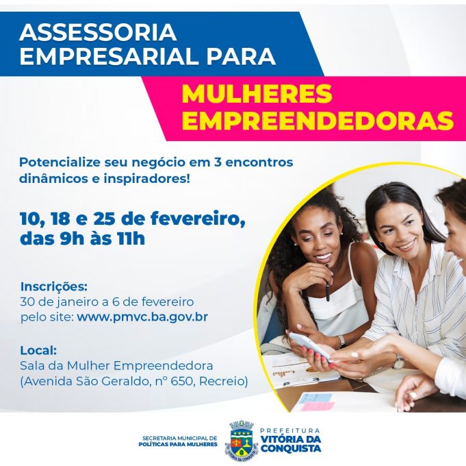 O evento será dividido em três encontros, nos dias 10, 18 e 25 de fevereiro, das 9h às 11h, na Sala da Mulher Empreendedora, situada na SMPM, localizada na Avenida São Geraldo, nº 650.