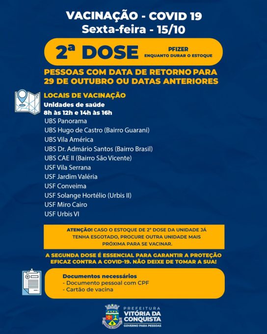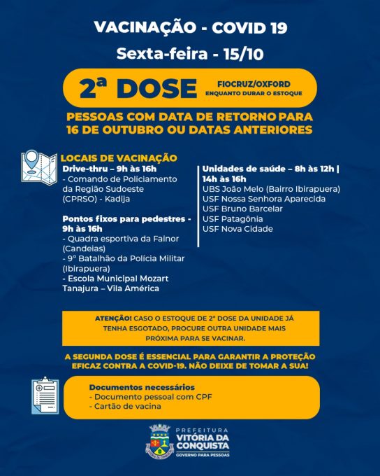 Para a 2ª dose da AstraZeneca estarão funcionando das 9h às 16h, o drive-thru do Comando de Policiamento da Região Sudoeste (CPRSO) e os pontos fixos do 9º Batalhão da Polícia Militar (Ibirapuera), quadra esportiva da Fainor (Candeias) e Escola Municipal Mozart Tanajura (Vila América). Das 8h às 12h e das 14h às 16h, as unidades João Melo (Bairro Ibirapuera), Nossa Senhora Aparecida, Bruno Barcelar, Patagônia e Nova Cidade.