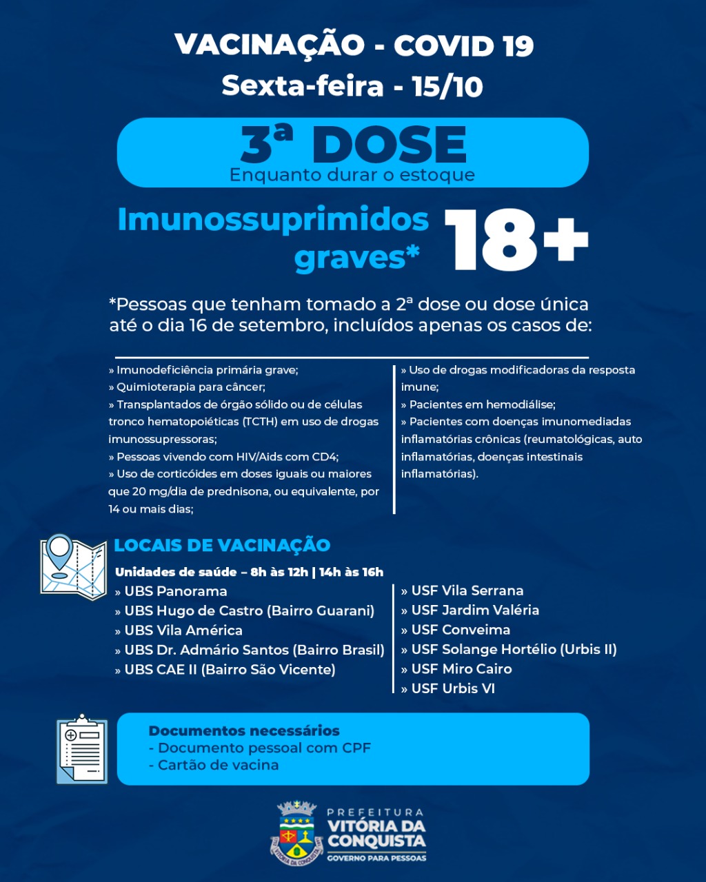 A 3ª dose também continua em 11 unidades de saúde para os idosos de 78 anos ou mais que tomaram a 2ª dose até o dia 15 de abril e os imunossuprimidos graves com 18 anos ou mais, que tenham recebido a 2ª dose até o dia 16 de setembro.