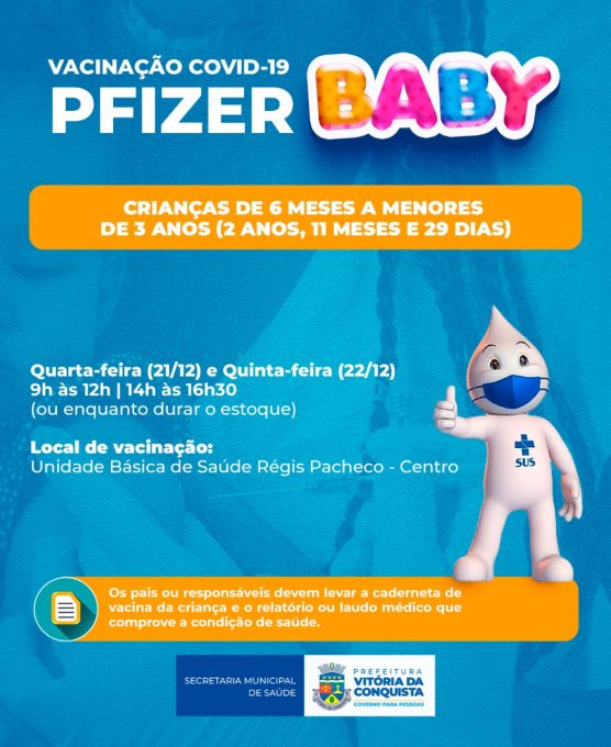 A coordenação de Imunização da Secretaria Municipal de Saúde (SMS) recolheu algumas doses da vacina Pfizer Baby que sobraram da vacinação nas unidades de saúde da zona rural e vai disponibilizá-las nesta quarta (21) e quinta-feira (22), na Unidade de Saúde Régis Pacheco, no Centro, para as crianças de 6 meses a menores de 2 anos.