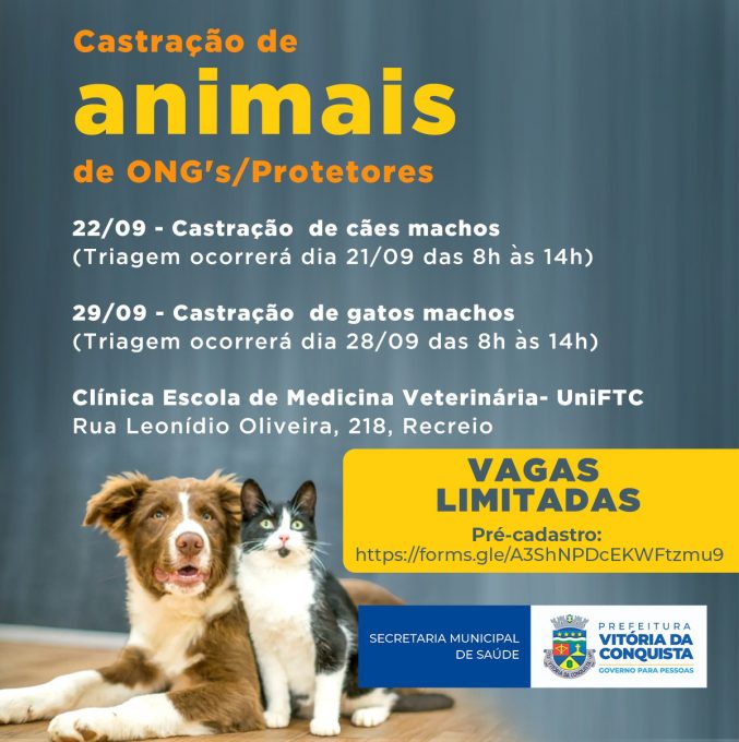 A primeira ação de castração ocorrerá na próxima quinta-feira (22) para cães machos, e no dia 29 para gatos machos. Após o contato do CCZ, conforme ordem de preenchimento do pré-cadastro, os responsáveis deverão comparecer à clínica, das 8h às 14h, no dia que antecede à castração para fazer a triagem do animal. É preciso apresentar documento com foto, comprovante de residência de Vitória da Conquista e cartão de vacinação do animal.