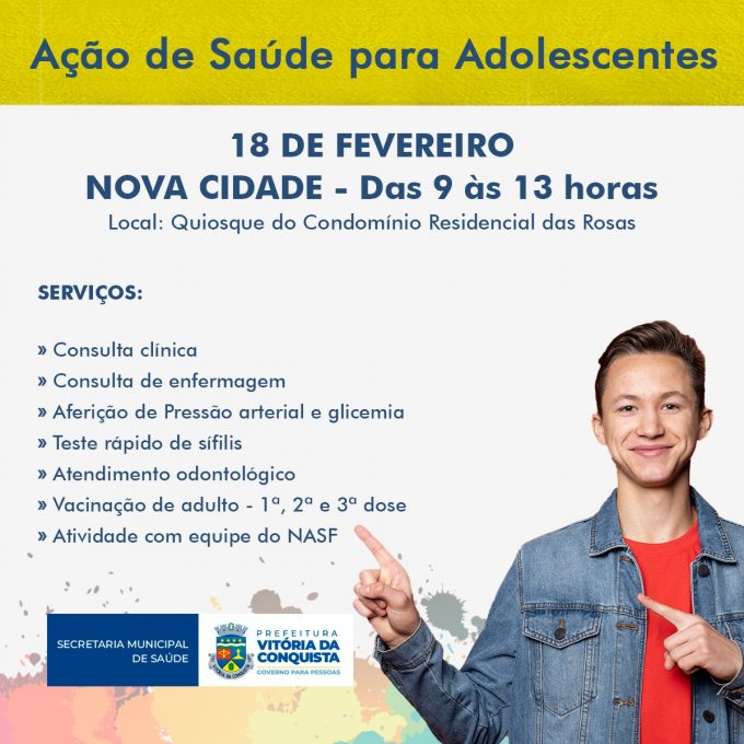 Mais uma ação de saúde voltada para os adolescentes será realizada nesta sexta-feira (18), dessa vez no bairro Nova Cidade. A equipe da Secretaria Municipal de Saúde (SMS) estará, de 9h às 13h, no quiosque do Condomínio Residencial das Rosas, levando diversos serviços para os adolescentes da região. Serão consultas clínicas e de enfermagem, aferição de pressão arterial e glicemia, teste rápido para detecção da sífilis e atividades físicas.