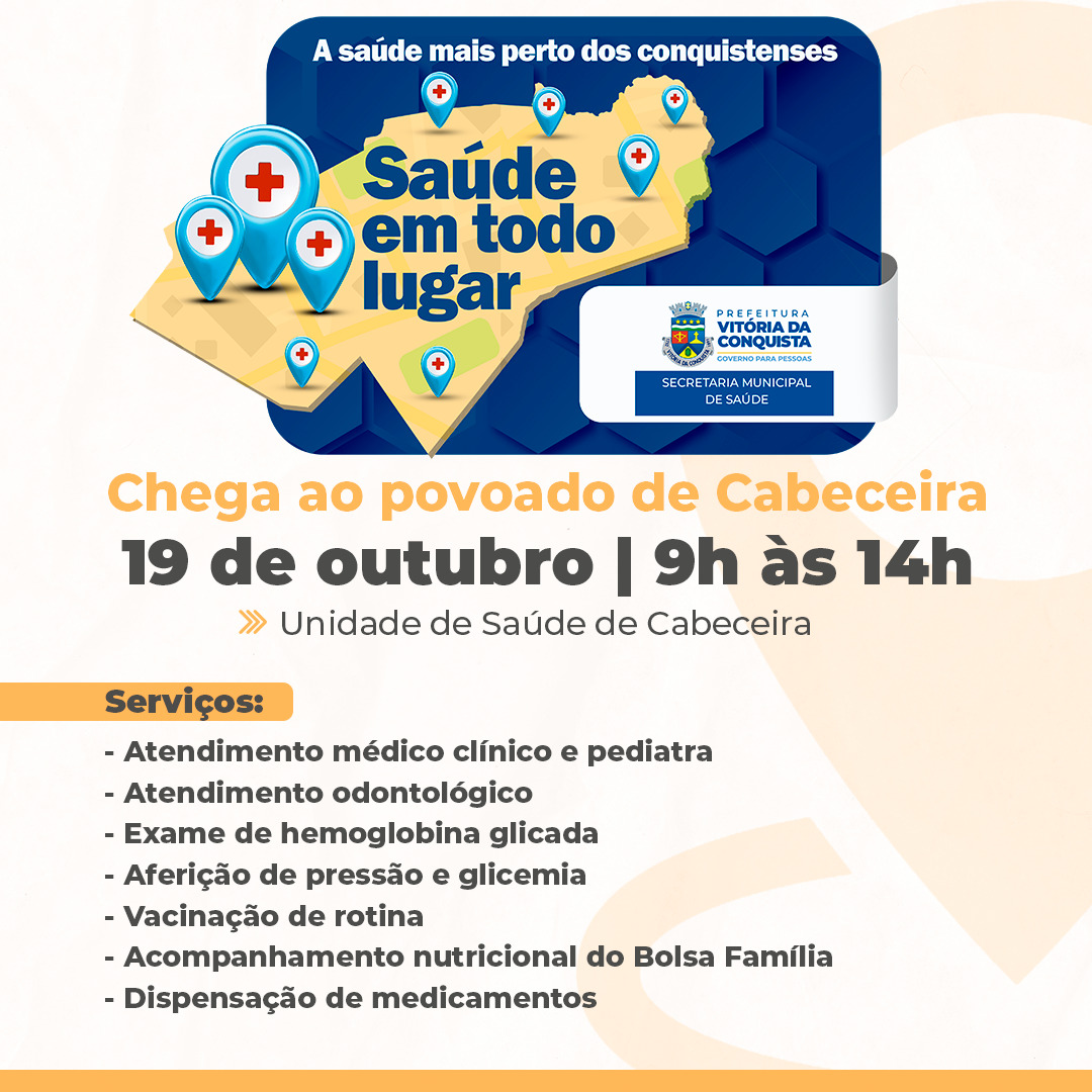 O projeto Saúde em Todo Lugar chega, na próxima terça-feira (19), ao povoado de Cabeceira, no distrito de José Gonçalves. A ação será de 9h às 14h, no posto saúde do povoado.