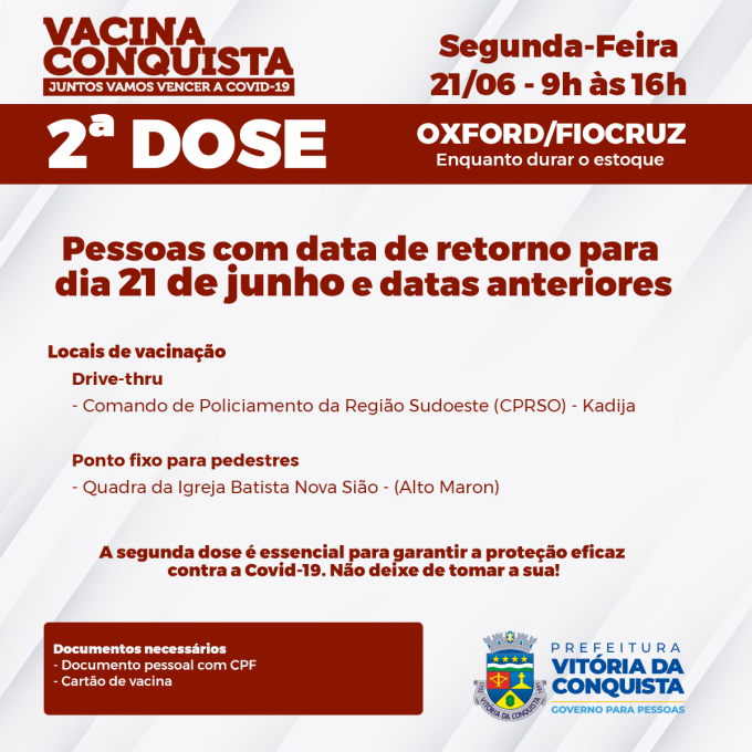 Já na segunda-feira (21), aqueles que estão com a data de retorno marcada para 21 de junho ou datas anteriores poderão se vacinar das 9h às 16h, apenas em dois pontos: drive-thru no Comando de Policiamento da Região Sudoeste (CPRSO), no bairro Kadija, e ponto fixo para pedestres da quadra da Igreja Nova Sião (Alto Maron).