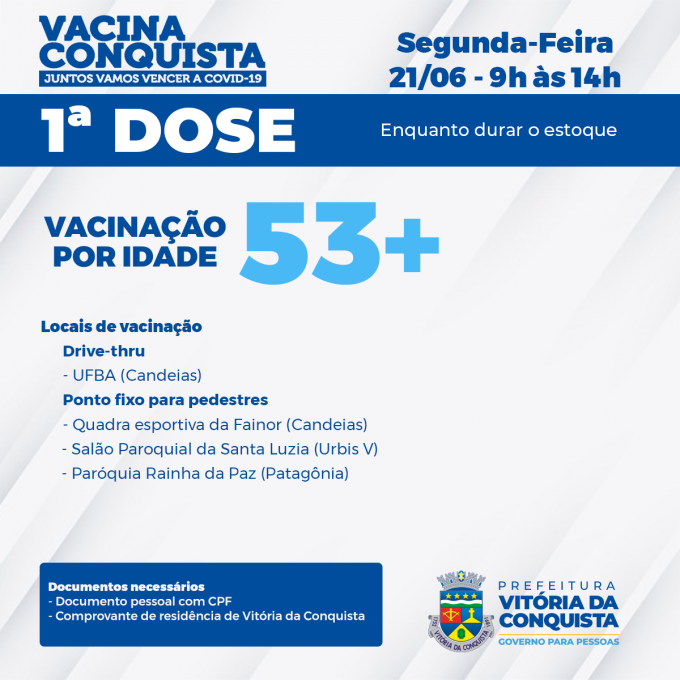 Vacinação por idade – A população com 53 anos ou mais será vacinada na segunda (21), das 9h às 14h. O critério da vacinação só por idade, adotado a partir de agora, segue a resolução da Comissão Intergestores Bipartite (CIB). Para se vacinar, a pessoa deve se dirigir a um dos quatro pontos de vacinação (Fainor, Santa Luzia, Rainha da Paz ou drive-thru na UFBA), levando o documento pessoal com CPF e o comprovante de residência de Vitória da Conquista.