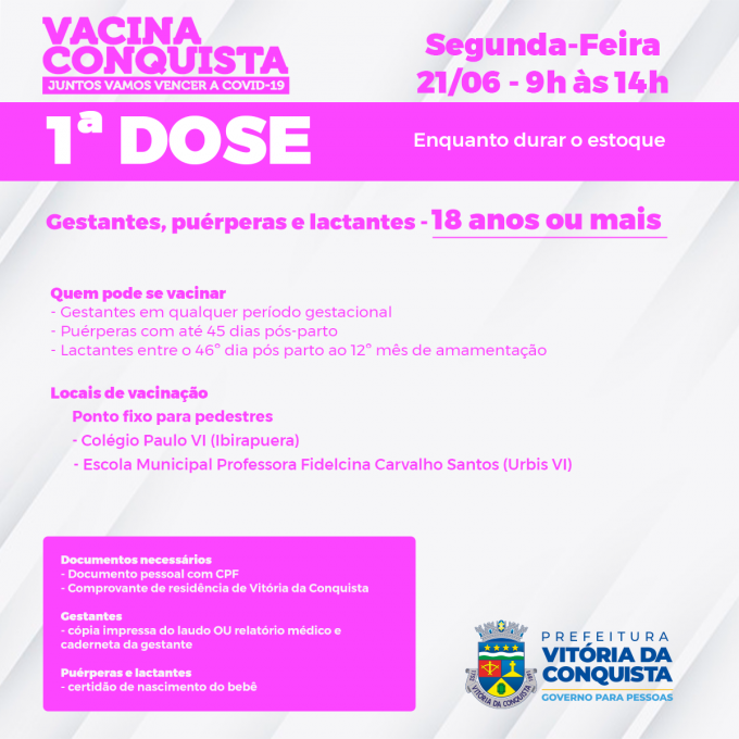 Gestantes, Puérperas e Lactantes – Na segunda-feira (21), a vacinação continua para gestantes e puérperas e retorna para lactantes com 18 anos ou mais. Essas mulheres podem ser atendidas nos pontos fixos para pedestres do Colégio Paulo VI (Ibirapuera) e Escola Municipal Professora Fidelcina Carvalho Santos (Urbis VI) das 9h às 14h.