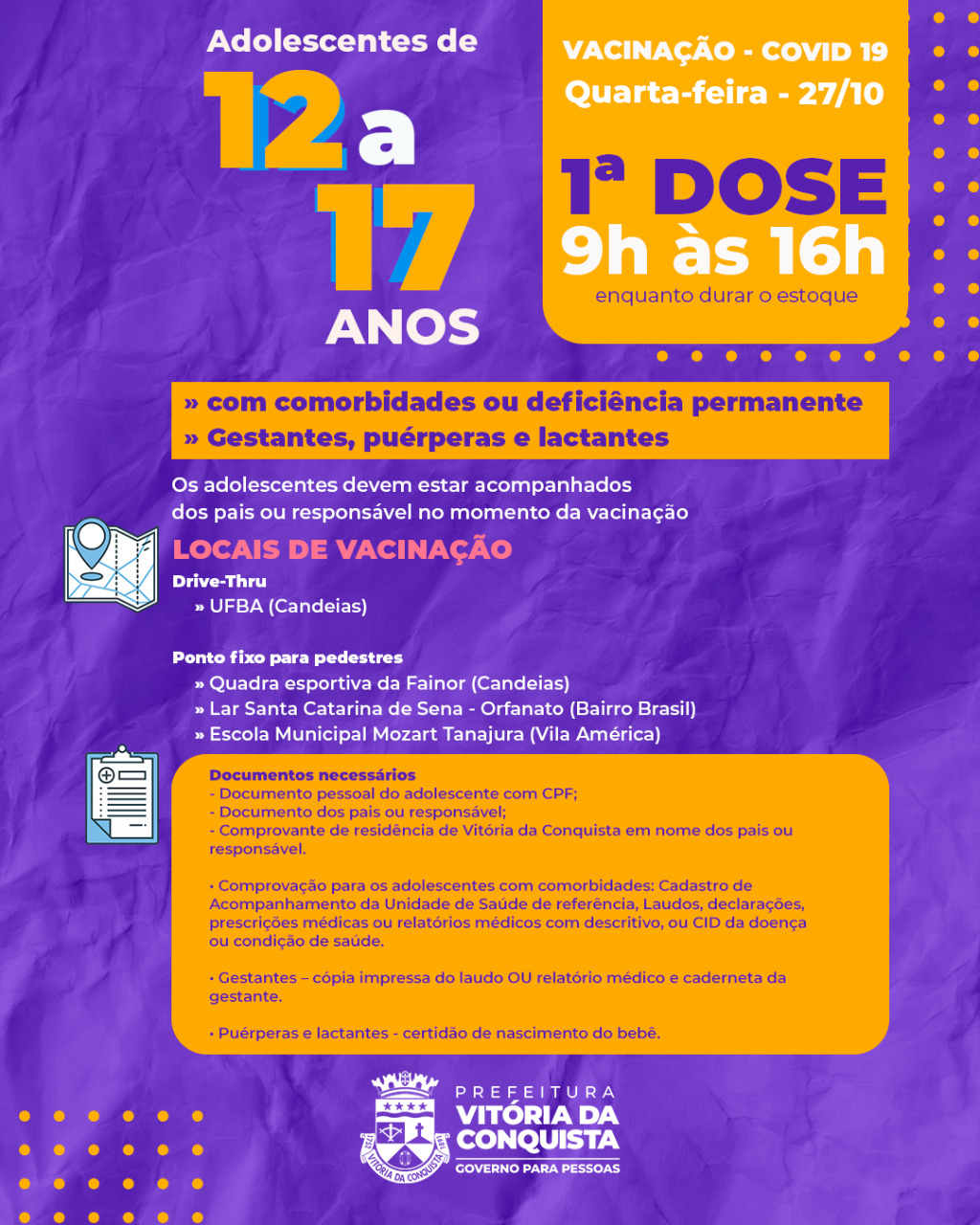 No momento da vacinação, os adolescentes precisam estar acompanhados dos pais ou responsáveis, portando documento pessoal do adolescente com CPF; documento dos pais ou responsável; comprovante de residência de Vitória da Conquista em nome dos pais ou responsável.