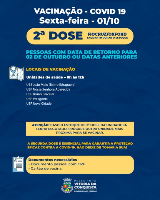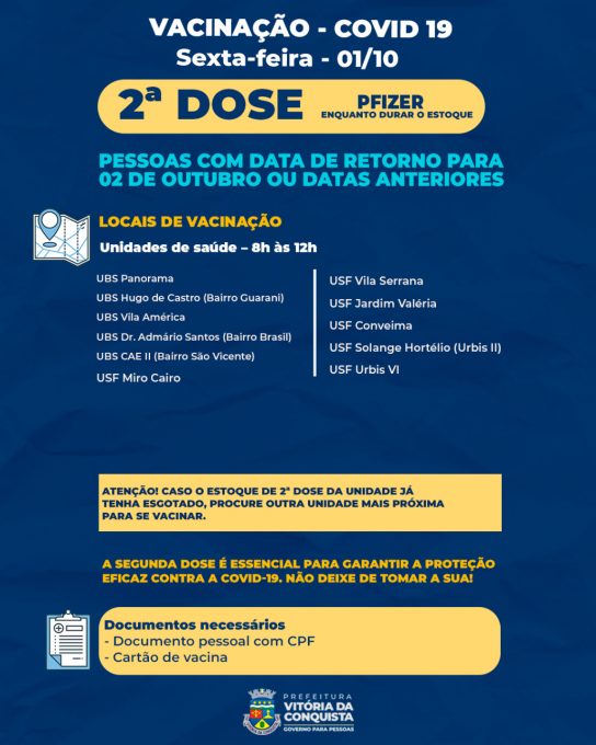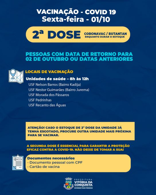 Poderão completar o esquema vacinal aqueles que estão com data de retorno para 2ª dose da Coronavac, AstraZeneca ou Pfizer, agendada para o dia 2 de outubro ou datas anteriores. Os locais de vacinação estão divididos por fabricantes de cada vacina. Confira abaixo:
