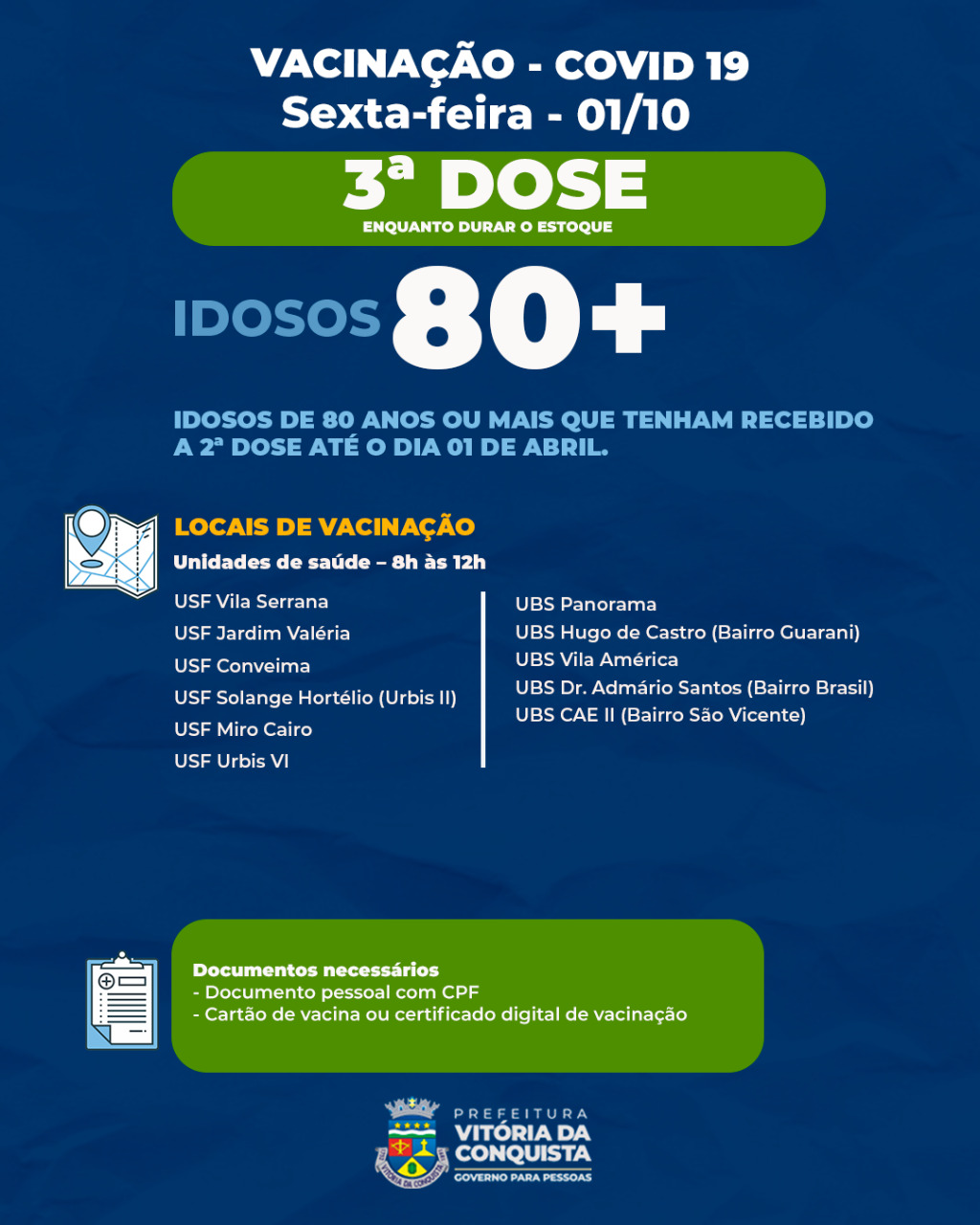 A 3ª dose estará disponível em 11 unidades de saúde para os idosos de 80 anos ou mais que tenham tomado a 2ª dose até o dia 1º de abril e para as pessoas com alto grau de imunossupressão, com 18 anos ou mais, que tomaram a 2ª dose até o dia 3 de setembro. Veja os locais: