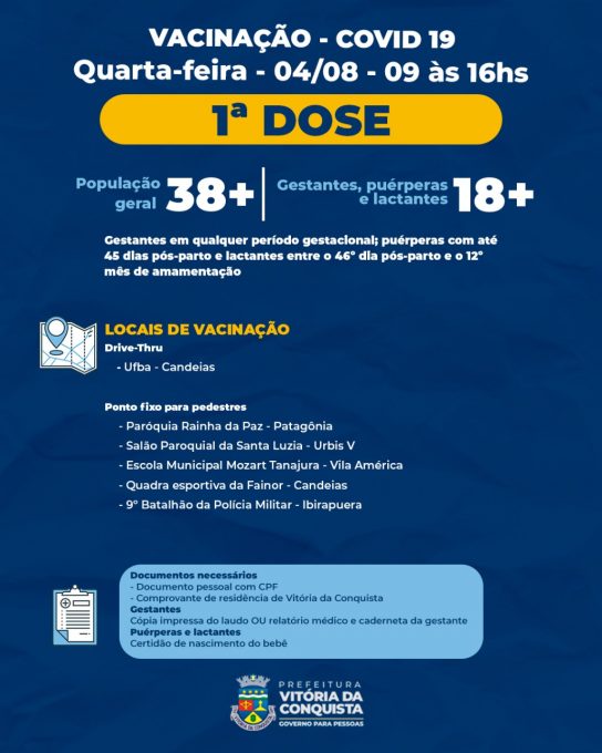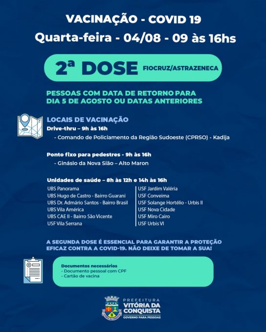 SEGUNDA DOSE – Para aqueles que tomaram a 1ª dose da AstraZeneca/Fiocruz e estão com data de retorno para 2ª marcada para o dia 5 de agosto ou datas anteriores, pode procurar os pontos fixos de drive-thru no Comando de Policiamento da Região Sudoeste (CPRSO), no bairro Kadija, e para pedestres no ginásio da Nova Sião (Alto Maron), das 9h às 16h.