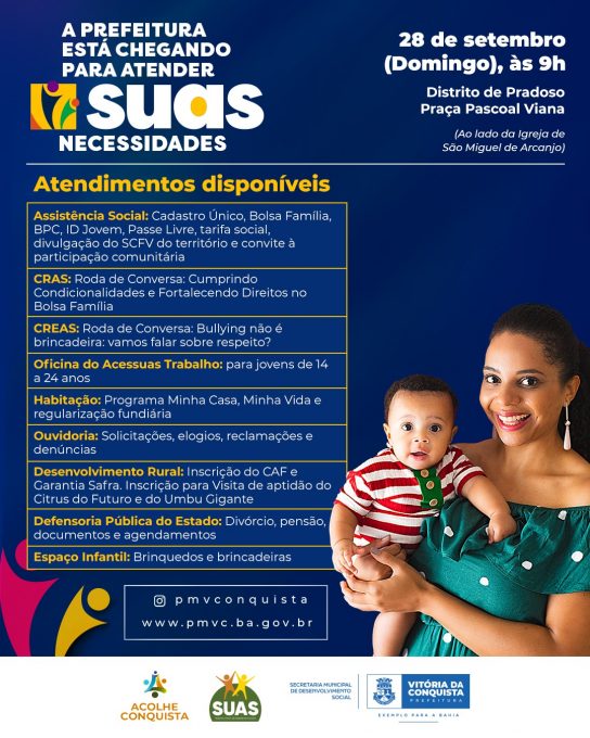 A Prefeitura de Vitória da Conquista, por meio da Secretaria Municipal de Desenvolvimento Social (Semdes), realiza a 18ª edição do programa Suas na Comunidade 2025, neste domingo (28), no distrito de Pradoso. A ação será realizada a partir das 9h, na praça Pascoal Viana, ao lado da Igreja São Miguel Arcanjo.