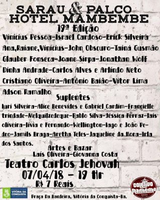 O Teatro Municipal Carlos Jehovah volta a ceder espaço para o projeto Sarau & Palco Aberto, que chega à sua 19ª edição neste sábado (7). Iniciativa do Coletivo Mambembe Bahia com apoio da Prefeitura Municipal, o projeto abre espaço para as mais diversas manifestações artísticas e tem revelado muitos talentos.