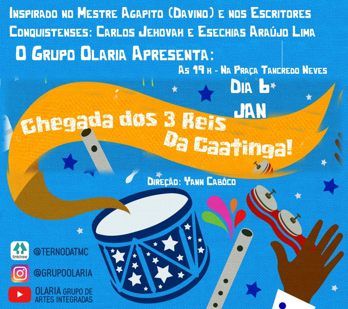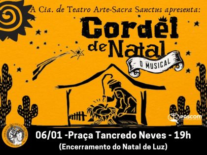 Com ênfase em características regionais, a Secretaria de Cultura, Esporte, Turismo e Lazer (Sectel) promove, nesta quinta, o encontro dos ternos de Reis (Março São Sebastião Estrela Dalva, Raio de Sol, Divino Espírito Santo, São José da Paz, Deus é Brasileiro e Terno das Rosas) e a apresentação da companhia de teatro Arte Sacra Sanctus, da paróquia São Miguel Arcanjo, com o musical ‘Cordel de Natal’.