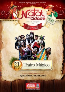 O Teatro Mágico é a atração desta sexta-feira, 21, no Natal da Cidade de Vitória da Conquista. Formado em 2003, o grupo musical subirá ao palco da Praça Barão do Rio Branco levando um espetáculo que mistura música com poesia, circo, teatro e literatura.