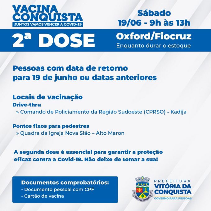 SEGUNDA DOSE – Continua também a aplicação da 2ª dose da AstraZeneca/Oxford para as pessoas que estão com data de retorno marcada para o dia 19 de junho ou datas anteriores. A vacinação será de 9h às 13h, apenas em dois pontos: drive-thru no Comando de Policiamento da Região Sudoeste (CPRSO), no bairro Kadija, e ponto fixo para pedestres da quadra da Igreja Nova Sião (Alto Maron).