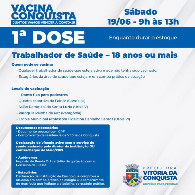 PRIMEIRA DOSE – Neste sábado (19), a aplicação da 1ª dose para os trabalhadores da saúde será de 9h às 13h, nos pontos fixos da quadra esportiva da Fainor (Candeias), Escola Municipal Professora Fidelcina Carvalho Santos (Urbis VI), Paróquia Rainha da Paz (Patagônia) e Salão Paroquial da Santa Luzia (Urbis V).