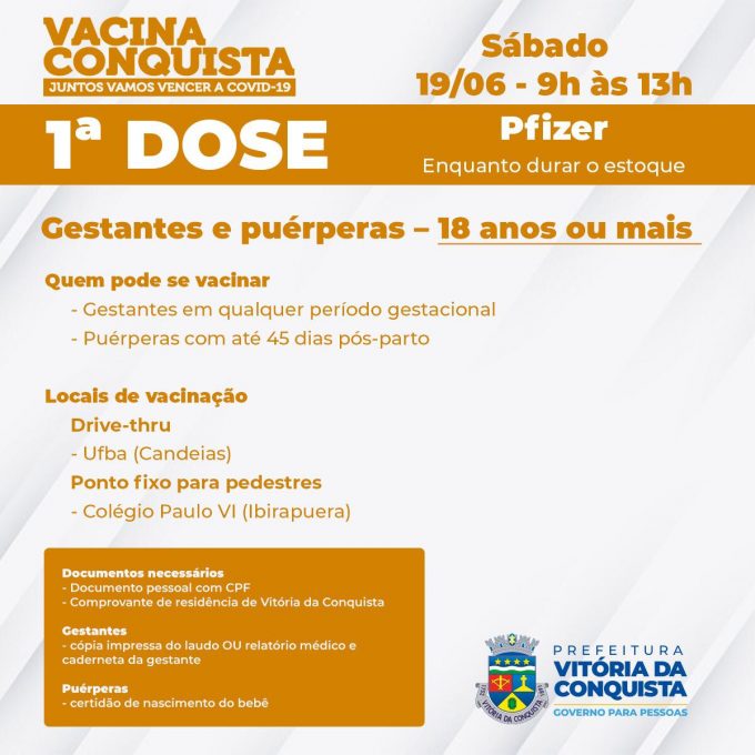 Para as gestantes e puérperas, a vacinação vai acontecer no drive-thru da Ufba e no ponto fixo para pedestres do Colégio Paulo. A documentação para gestantes com 18 anos ou mais, a documentação comprobatória teve alteração e agora pode ser apresentado um dos seguintes documentos: cópia impressa do laudo ou relatório médico e caderneta da gestante.