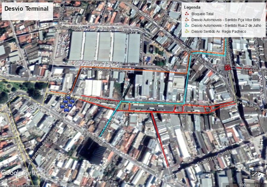 Na Av. Régis Pacheco, os veículos entram à direita, na Rua Francisco Andrade e descem pela Travessa Lauro de Freitas, entrando na Av. Lauro de Freitas e contornando sentido a Tv. 2 de Julho.