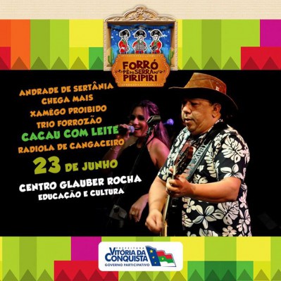 O Forró Pé de Serra do Piripiri 2015 chega à sua quinta e última noite nesta terça-feira, 23, em grande estilo e com duas atrações convidadas: primeiro, o Trio Forrozão, que traz – como o próprio nome já denuncia – o forró pé de serra na veia, em estado puro, garantindo um toque a mais de simpatia e autenticidade ao evento junino de Vitória da Conquista. E, em seguida, a banda Cacau com Leite, uma das preferidas do gênero no Nordeste, que este ano completa 20 anos estreando no palco principal do Centro Glauber Rocha – Educação e Cultura.