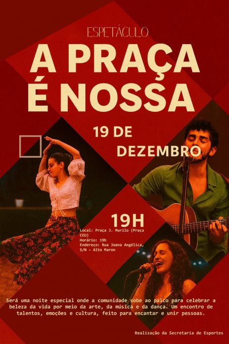 Com entrada gratuita, o evento contará com apresentações de diversas manifestações artísticas, como dança, música e poesia, com os objetivos de valorizar a cultura local e a ocupação dos espaços públicos por meio da arte.