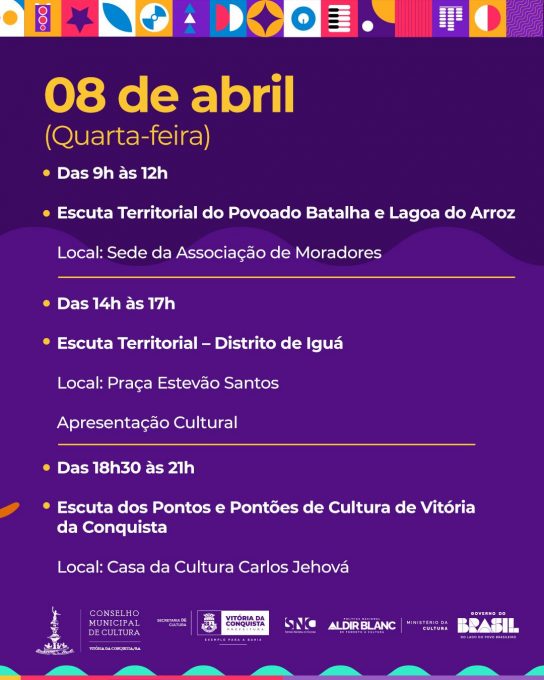 Para Aléxis Góis, o consultor responsável pelo desenvolvimento do Plano, as escutas fortalecem e qualificam a elaboração do Plano Municipal de Cultura. “Com elas, podemos avaliar como está o acesso aos direitos culturais e também à produção cultural nesses locais.” Ele também destacou que apesar do encerramento da etapa presencial, a escuta on-line segue disponível até o dia 22 de abril. Para contribuir, basta clicar aqui.