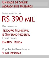 Mais de 5 mil pessoas serão beneficiadas com a Unidade de Saúde Morada dos Pássaros, entregue neste domingo, 5, pela Prefeitura de Vitória da Conquista. Construída a partir de um investimento superior a R$ 390 mil de recursos do Município e do Governo Federal, o equipamento será responsável pelas ações de promoção, prevenção e atendimento em saúde da comunidade dos loteamentos Morada dos Pássaros I, II e III, localizados no bairro Felícia.