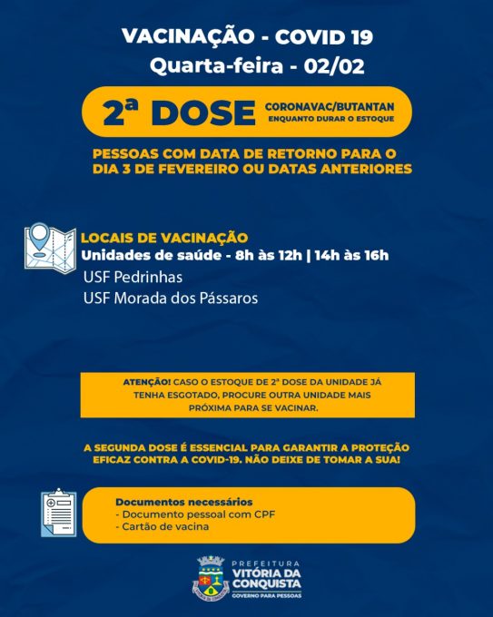 A vacinação com a 2ª dose da Pfizer, com retorno até o dia 3 de fevereiro, ou a 2ª dose da Fiocruz/Oxford em atraso, estará disponível nas unidades de saúde da família Conveima, Solange Hortélio (Urbis II), Jardim Valéria e Miro Cairo. Com a falta do imunizante da Fiocruz/Oxford no município, a 2ª dose está sendo feita com a vacina da Pfizer.