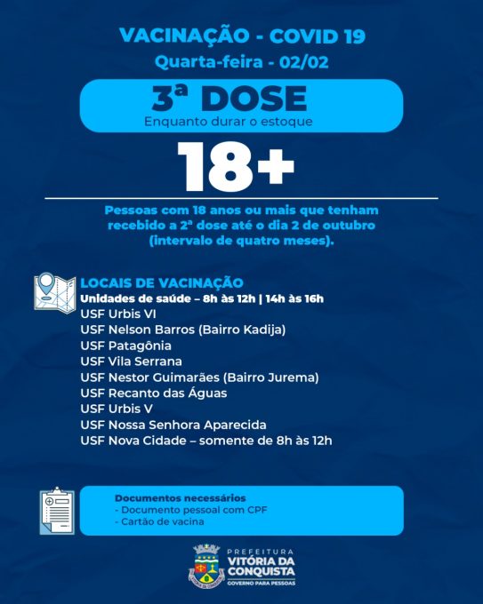 Já a 3ª dose será para os adultos que tomaram a 2ª dose até o dia 2 de outubro (intervalo de quatro meses), além de imunossuprimidos que tomaram a 2ª dose até o dia 4 de janeiro (intervalo de 28 dias). A vacinação acontece em nove unidades: Urbis VI, Nelson Barros (Bairro Kadija), Patagônia, Vila Serrana, Nestor Guimarães (Bairro Jurema), Recanto das Águas, Urbis V e Nossa Senhora Aparecida. Na unidade Nova Cidade, a vacinação acontece somente no turno da manhã.