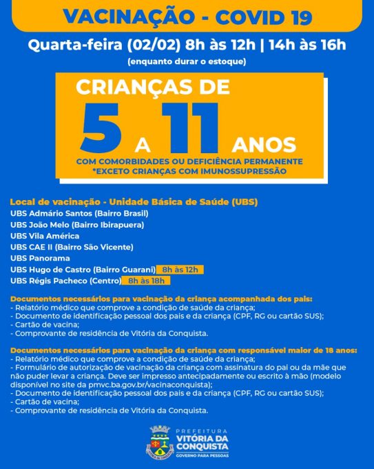 É necessário o documento de identificação dos pais e da criança (CPF, RG ou cartão SUS), cartão de vacina e comprovante de residência de Vitória da Conquista. Para crianças com comorbidades ou deficiência permanente, é preciso apresentar também relatório médico que comprove a condição de saúde.