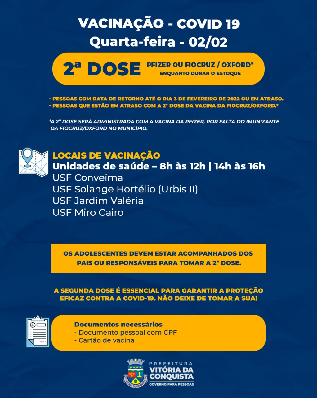 A vacinação com a 2ª dose da Pfizer, com retorno até o dia 3 de fevereiro, ou a 2ª dose da Fiocruz/Oxford em atraso, estará disponível nas unidades de saúde da família Conveima, Solange Hortélio (Urbis II), Jardim Valéria e Miro Cairo. Com a falta do imunizante da Fiocruz/Oxford no município, a 2ª dose está sendo feita com a vacina da Pfizer.