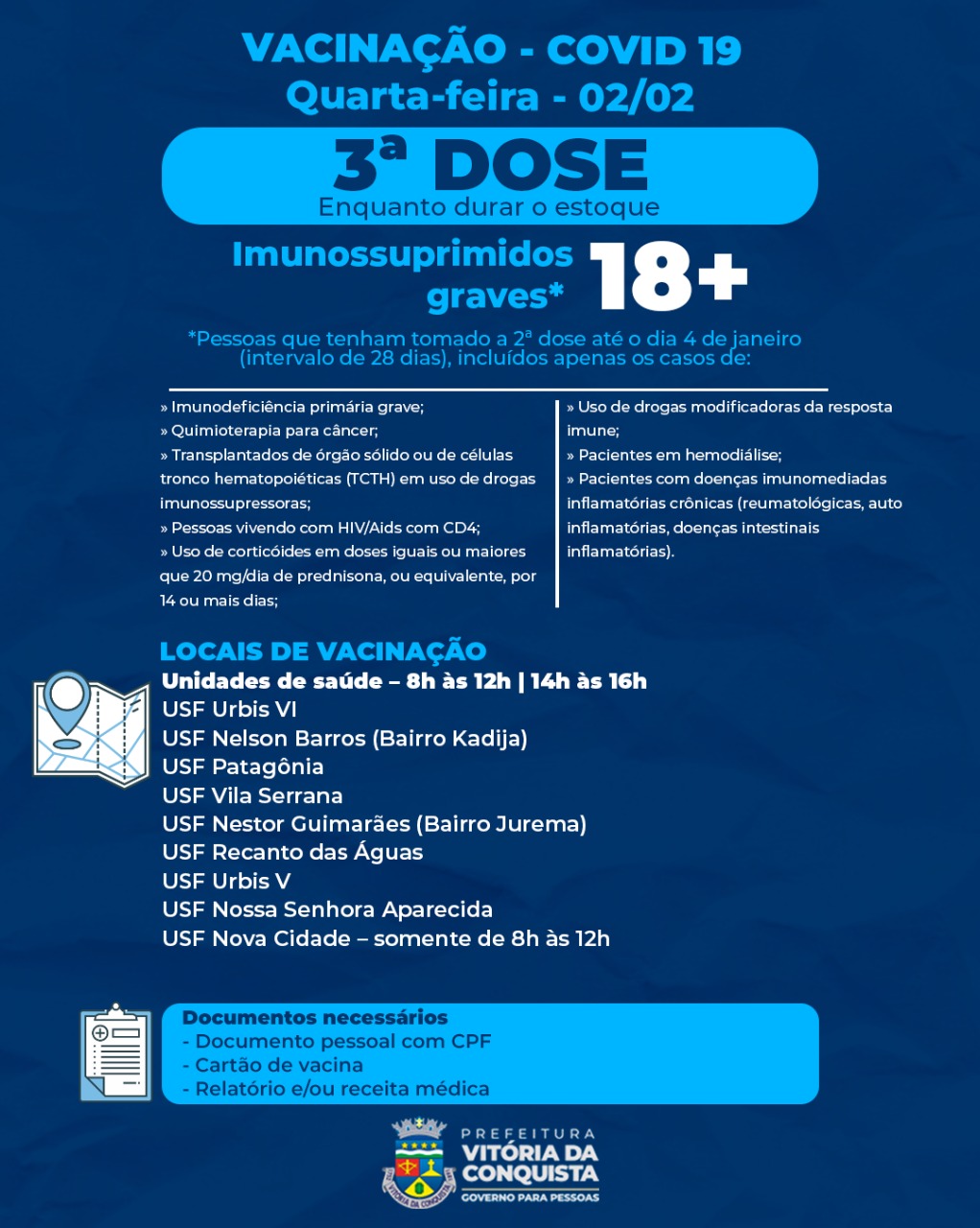 Já a 3ª dose será para os adultos que tomaram a 2ª dose até o dia 2 de outubro (intervalo de quatro meses), além de imunossuprimidos que tomaram a 2ª dose até o dia 4 de janeiro (intervalo de 28 dias). A vacinação acontece em nove unidades: Urbis VI, Nelson Barros (Bairro Kadija), Patagônia, Vila Serrana, Nestor Guimarães (Bairro Jurema), Recanto das Águas, Urbis V e Nossa Senhora Aparecida. Na unidade Nova Cidade, a vacinação acontece somente no turno da manhã.