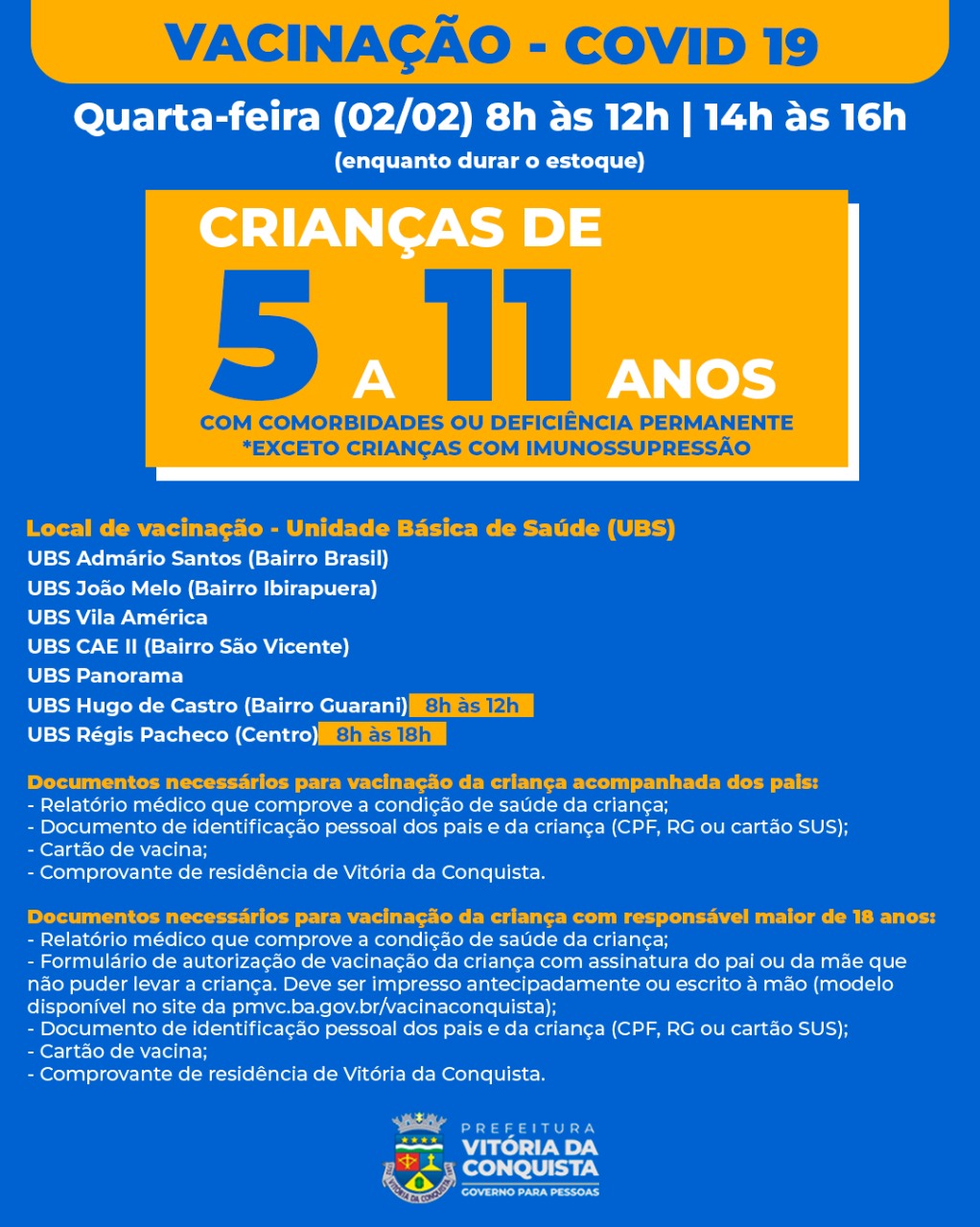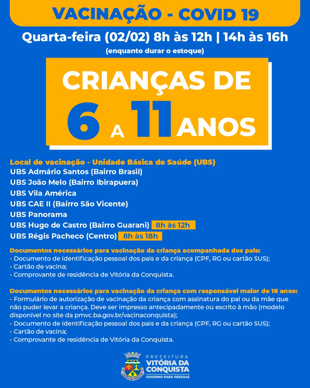 É necessário o documento de identificação dos pais e da criança (CPF, RG ou cartão SUS), cartão de vacina e comprovante de residência de Vitória da Conquista. Para crianças com comorbidades ou deficiência permanente, é preciso apresentar também relatório médico que comprove a condição de saúde.
