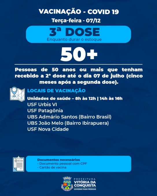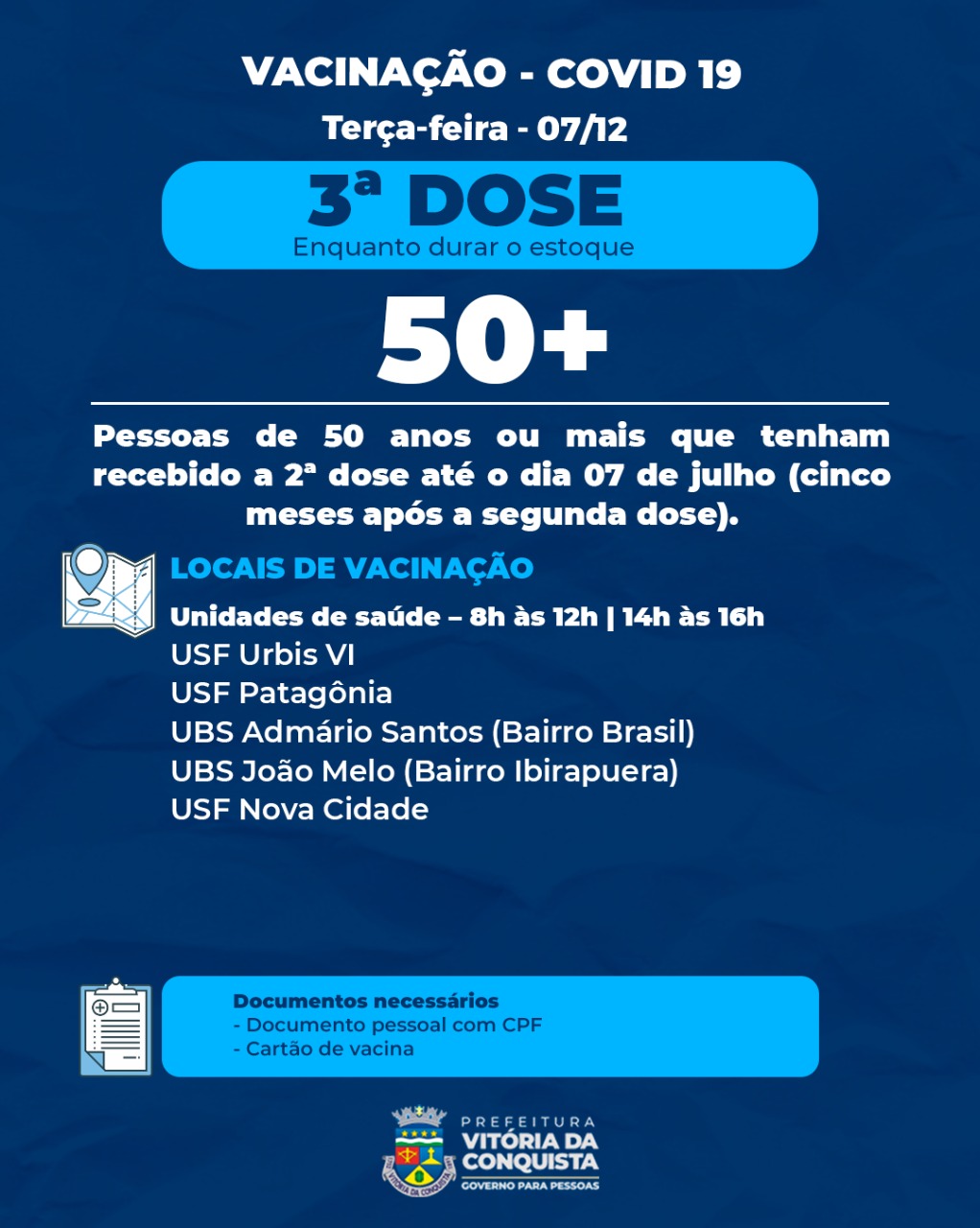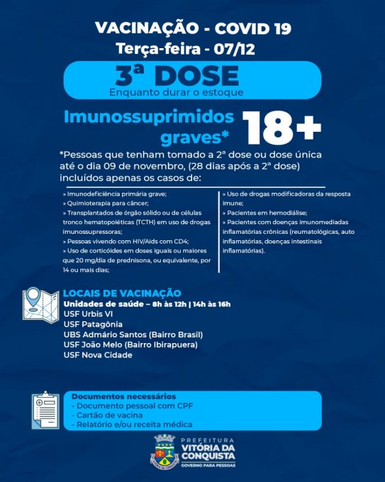 Para a 3ª dose, as pessoas com 50 anos ou mais que tomaram a 2ª dose há cinco meses (7 de julho) e imunossuprimidos graves que tomaram a 2ª dose há 28 dias (9 de novembro), a vacinação será feita em cinco unidades de saúde. Confira abaixo.