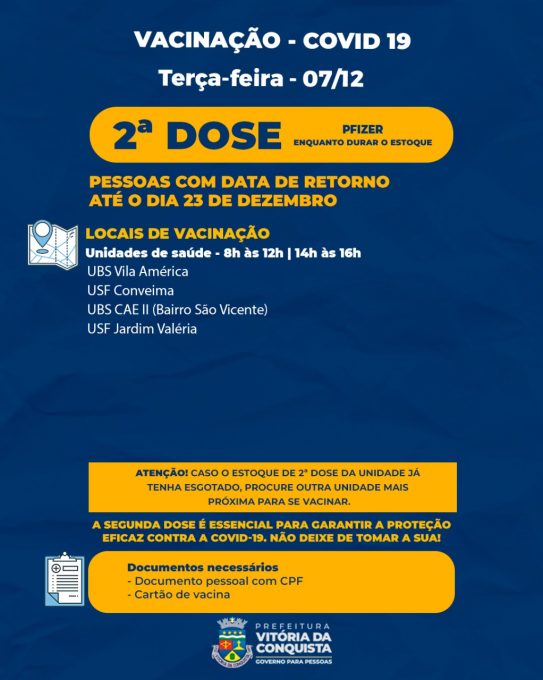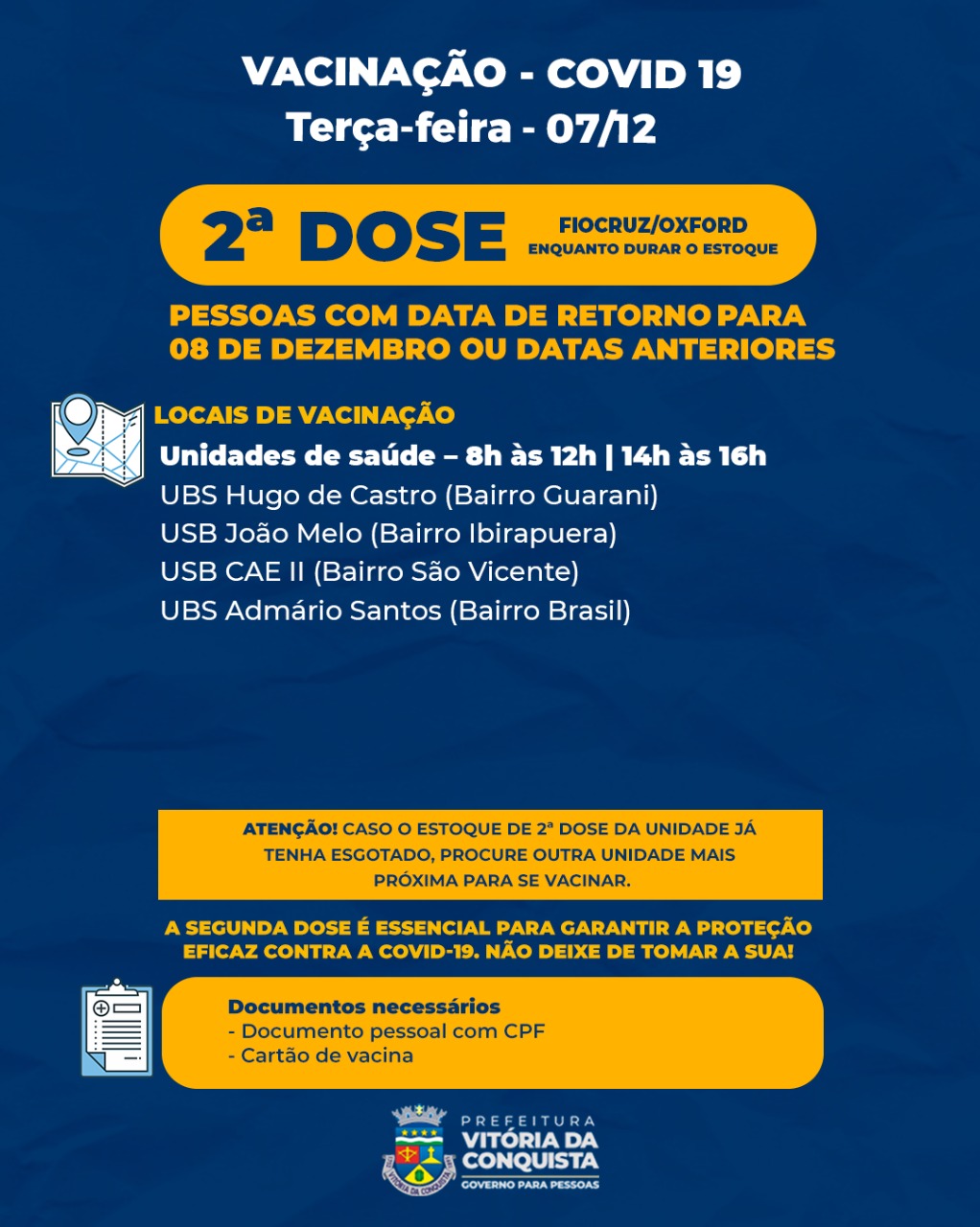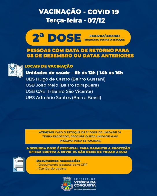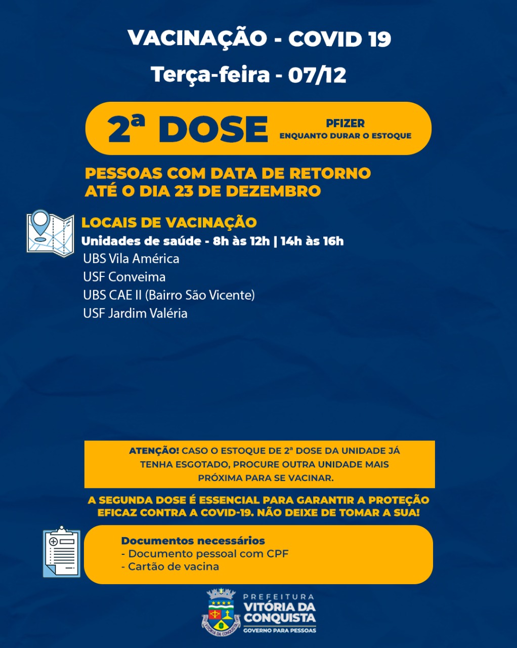A 2ª dose da Pfizer estará disponível em apenas quatro unidades de saúde, até enquanto durarem os estoques, com o adiantamento para as pessoas que estão com retorno até o dia 23 de dezembro. Já a 2ª dose da Coronavac/Butantan e Fiocruz/Oxford é destinada as pessoas que estão com agendamento para o dia 8 de dezembro ou datas anteriores, e estão divididas entre 12 unidades de saúde.