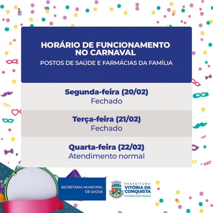 Na segunda e na terça-feira (21) de carnaval, as unidades de saúde da Atenção Básica e as farmácias da Família I e II não irão funcionar, conforme o decreto 22.466, que estabelece ponto facultativo em decorrência da celebração do Carnaval.