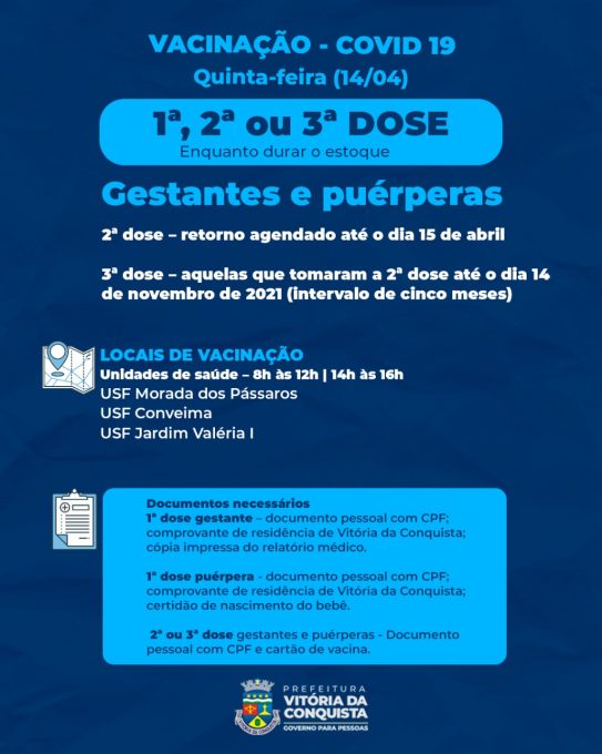 Nas unidades Morada dos Pássaros, Conveima e Jardim Valéria I, as gestantes e puérperas, acima de 12 anos, poderão se vacinar com a 1ª dose; 2ª dose, com retorno agendado até o dia 15 de abril; ou 3ª dose para aquelas que completaram o esquema vacinal com duas doses até o dia 14 de novembro (intervalo de cinco meses).