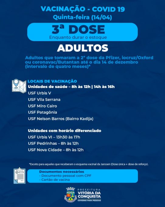Adultos – A 3ª dose estará disponível amanhã em oito unidades para os adultos que tomaram a 2ª dose até o dia 14 de dezembro de 2021. São elas: Urbis V, Vila Serrana, Miro Cairo, Patagônia e Nelson Barros (Bairro Kadija). Nas unidades Pedrinhas e Nova Cidade, a vacinação ocorre apenas no turno da manhã; e na unidade Urbis VI, a vacinação é de 13h30 às 17h.