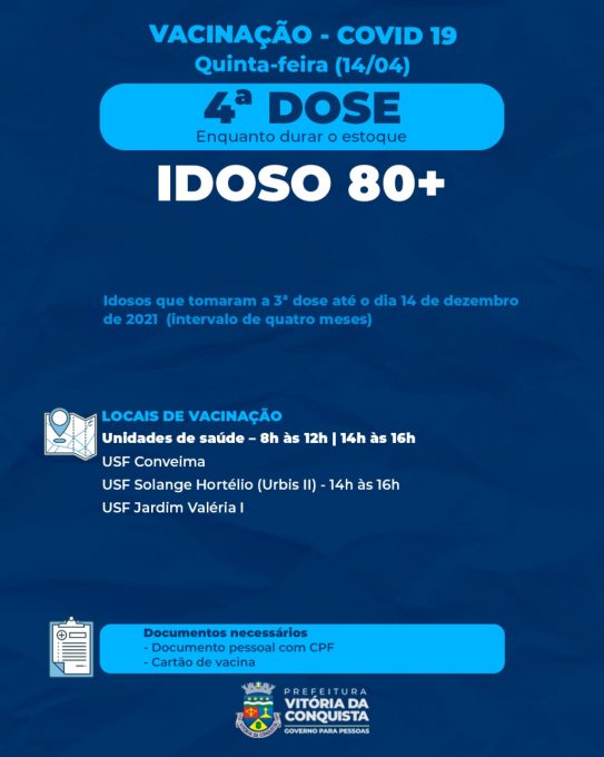 Nessas unidades, com exceção da USF Morada os Pássaros, os idosos de 80 anos ou mais poderão tomar a 4ª dose, desde que tenham tomado a 3ª dose até o dia 14 de dezembro de 2021 .