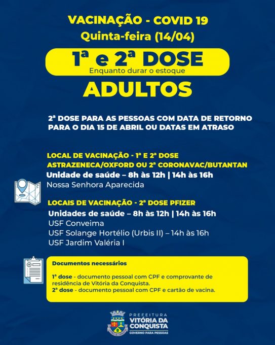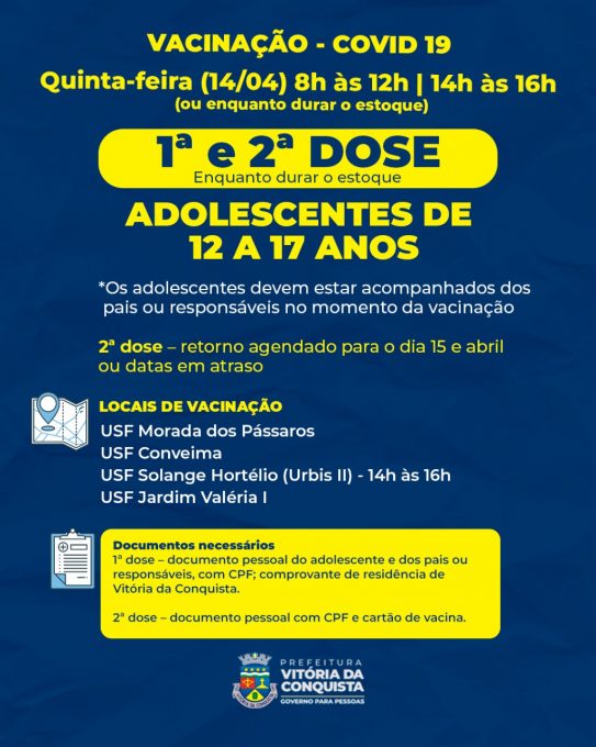 Também terá a 1ª dose para os adolescentes que ainda não foram vacinados e a 2ª dose para aqueles com retorno marcado até o dia 15 de abril, nas unidades Conveima, Morada dos Pássaros, Jardim Valéria I e e Solange Hortélio, essa última apenas no período da tarde. Os pais ou responsáveis devem acompanhá-los durante a vacinação.