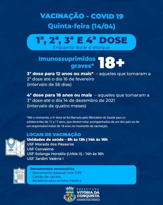 Crianças e adolescentes – Para o público infantil, terá a 1ª dose para aquelas entre 5 a 11 anos, 2ª dose da Coronavac de 6 a 11 anos, e a 2ª dose da Pfizer de 5 a 11 anos, com retorno marcado até o dia 14 de abril. A vacinação será na unidade Nestor Guimarães (Bairro Jurema), de 8h às 12h e de 14h às 16h; e na UBS Régis Pacheco (Centro), de 8h às 17h30, sem intervalo para o almoço.