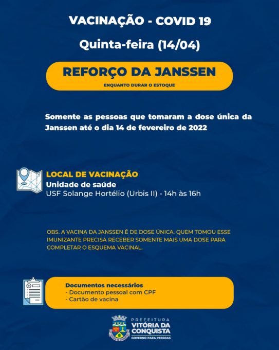 Aqueles que tomaram a dose única da Janssen até o dia 14 de fevereiro, deverão completar o esquema vacinal com a dose de reforço na USF Solange Hortélio, no turno da tarde.