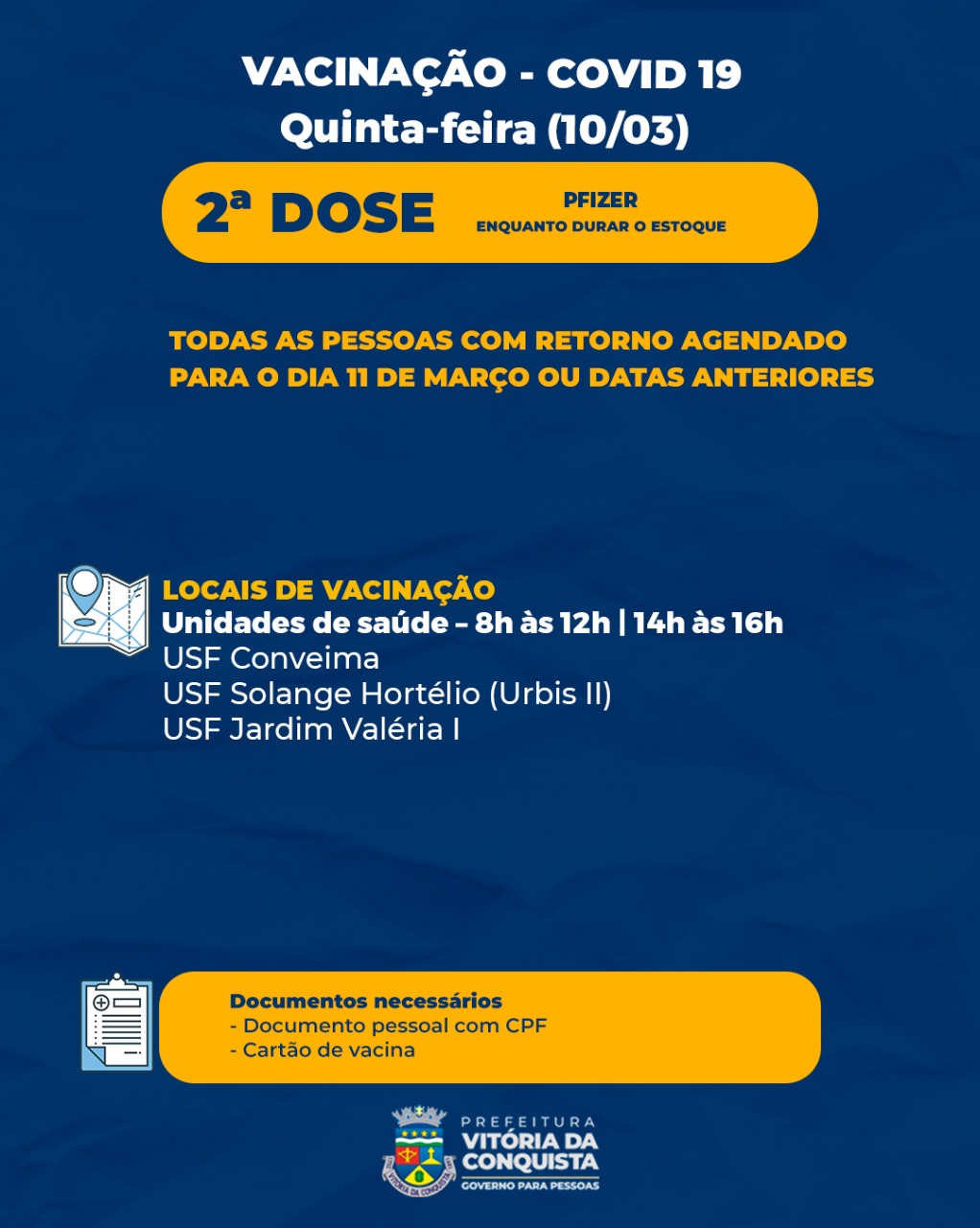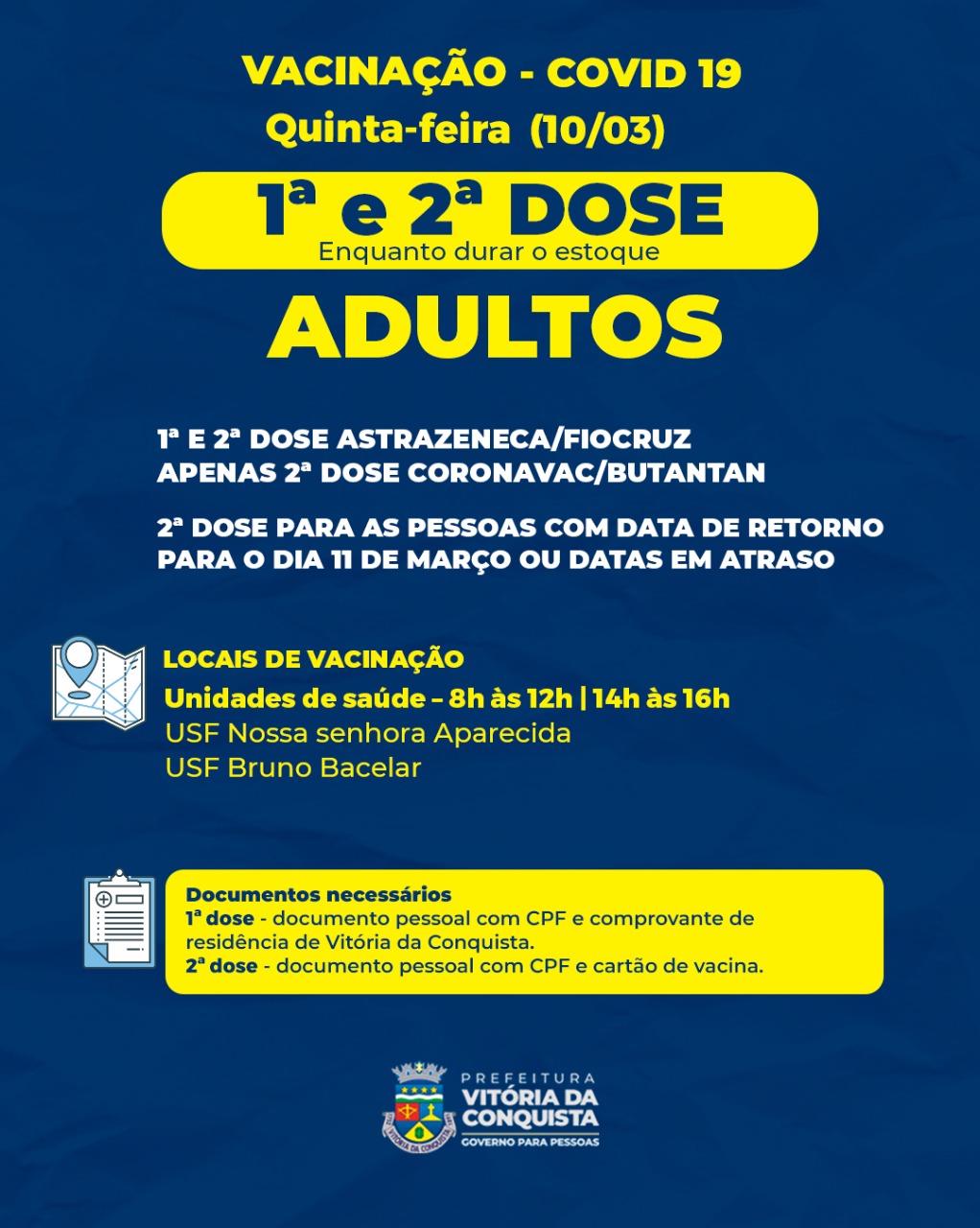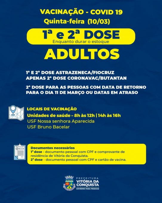 Também terá a 1ª dose da AstraZeneca/Fiocruz para os adultos não vacinados nas unidades de saúde Nossa Senhora Aparecida e Bruno Bacelar, que fará também a 2ª dose desse mesmo imunizante e da Coronavac/Butantan para aqueles com retorno agendado até o dia 11 de março ou datas em atraso. A 2ª dose da Pfizer, com retorno marcado para o dia 11 de março ou datas em atraso, pode ser encontrada nas unidades de saúde Conveima, Solange Hortélio (Urbis II) e Jardim Valéria I.