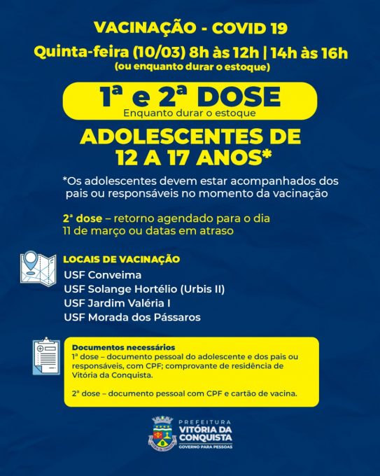 Para os adolescentes não vacinados, haverá a 1ª dose e a 2ª dose para aqueles que tiverem o retorno agendado até o dia 11 de março. Os pais ou responsáveis devem acompanhá-los durante a vacinação, apresentando a documentação exigida.