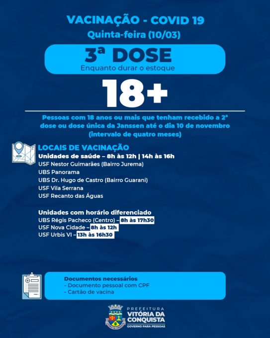 Adultos – A 3ª dose será para os adultos que tomaram a 2ª dose ou dose única até o dia 10 de novembro de 2021 (intervalo de quatro meses), será nas unidades USF Nestor Guimarães (Bairro Jurema), UBS Panorama, UBS Dr. Hugo de Castro (Bairro Guarani), USF Vila Serrana e USF Recanto das Águas.