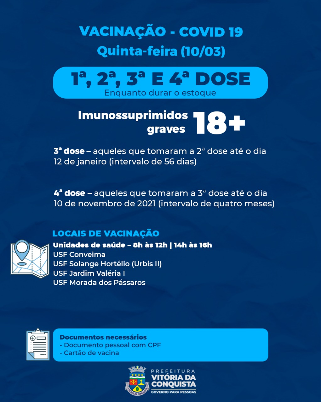 Haverá a 4ª dose para os imunossuprimidos que tomaram a 3ª dose até o dia 10 de novembro (intervalo de quatro meses), ou a 3ª dose aqueles tomaram duas doses até o dia 12 de janeiro (intervalo de 56 dias). Os imunocomprometidos que ainda não se vacinaram, poderão se vacinar com 1ª ou 2ª dose nesses locais.