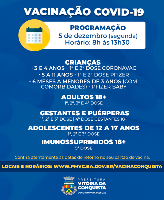 Documentação: Para a 1ª dose, é preciso apresentar o documento de identificação pessoal com CPF dos responsáveis e da criança (CPF ou cartão SUS); cartão de vacina; comprovante de residência de Vitória da Conquista. Para as crianças com comorbidades, é necessário apresentar também o relatório ou lado médico que comprove a condição de saúde. Já para a 2ª dose, é preciso somente o documento de identificação pessoal da criança e cartão de vacina.